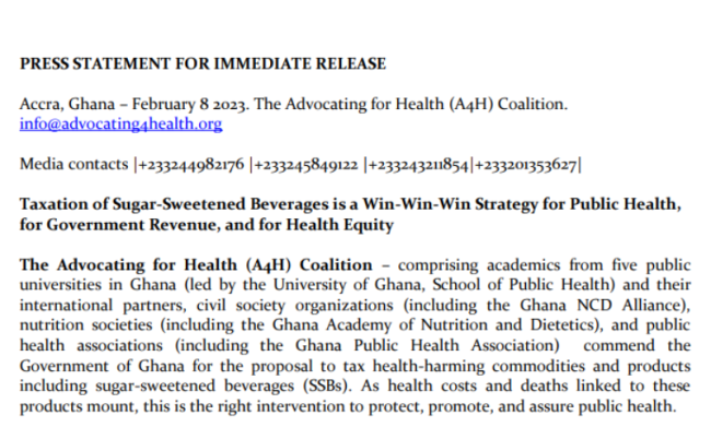Taxation of Sugar-Sweetened Beverages is a Win-Win-Win Strategy for Public Health, for Government Revenue, and for Health Equity (PDF) Related articles: https://www.advocating4health.org/press-release-taxation-of-sugar-sweetened-beverages/ https://metrotvonline.com/true-economic-health-costs-of-ssbs-staggering-a4h-coalition/ https://myoriginalonline.com/blog/a4h-ghana-commends-government-for-its-intended-taxation-of-sugar-sweetened-beverages/ https://www.ghanaweb.com/vip/ernestsenanudovlo/Taxing-sugar-sweetened-beverages-a-win-win-win-strategy-for-Ghana-A4H-Coalition-54767 https://mx24online.com/advocating-for-health-coalition-throws-support-behind-govts-proposal-to-tax-sugar-sweetened-beverages/ https://www.ghanaiantimes.com.gh/taxation-of-sugar-sweetened-beverages-is-a-win-win-win-strategy-for-public-health-for-government-revenue-and-for-health-equity/